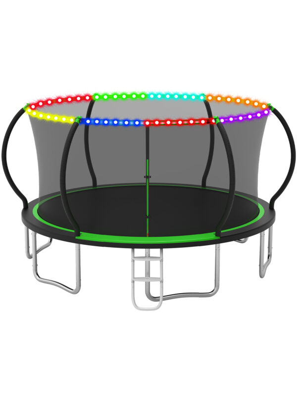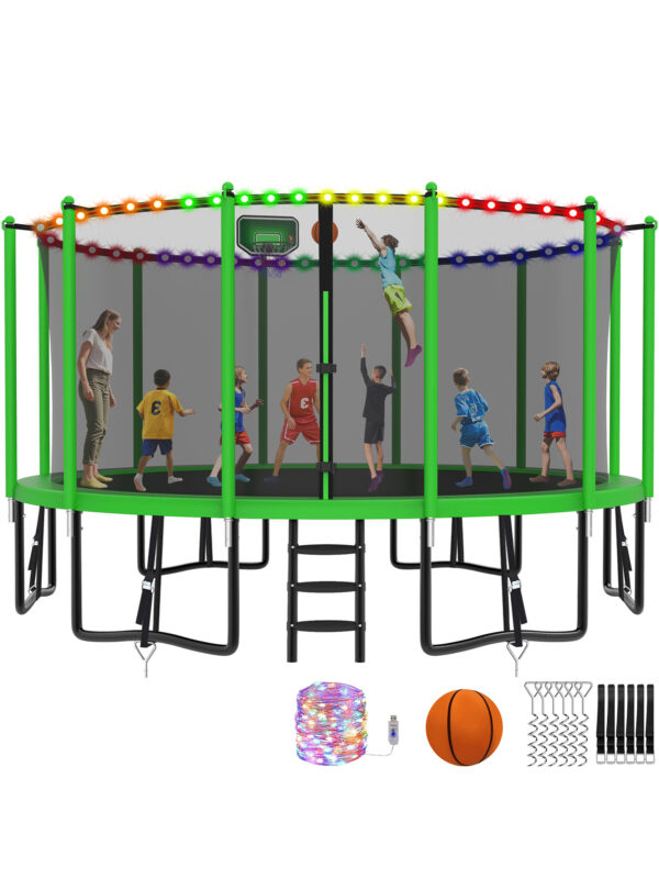 Alpha Series Trampoline with Basketball Hoop and Light, Sprinkler & Sock Set Green