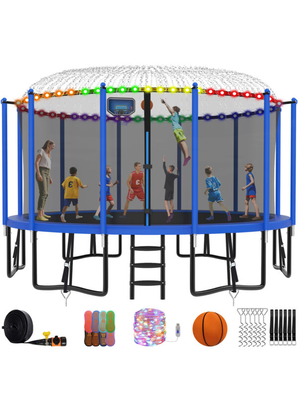 Alpha Series Trampoline with Basketball Hoop and Light, Sprinkler & Sock Set Blue