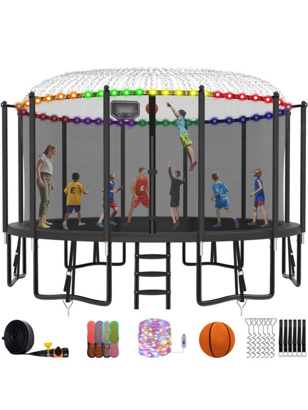 Alpha Series Trampoline with Basketball Hoop and Light, Sprinkler & Sock Set Black