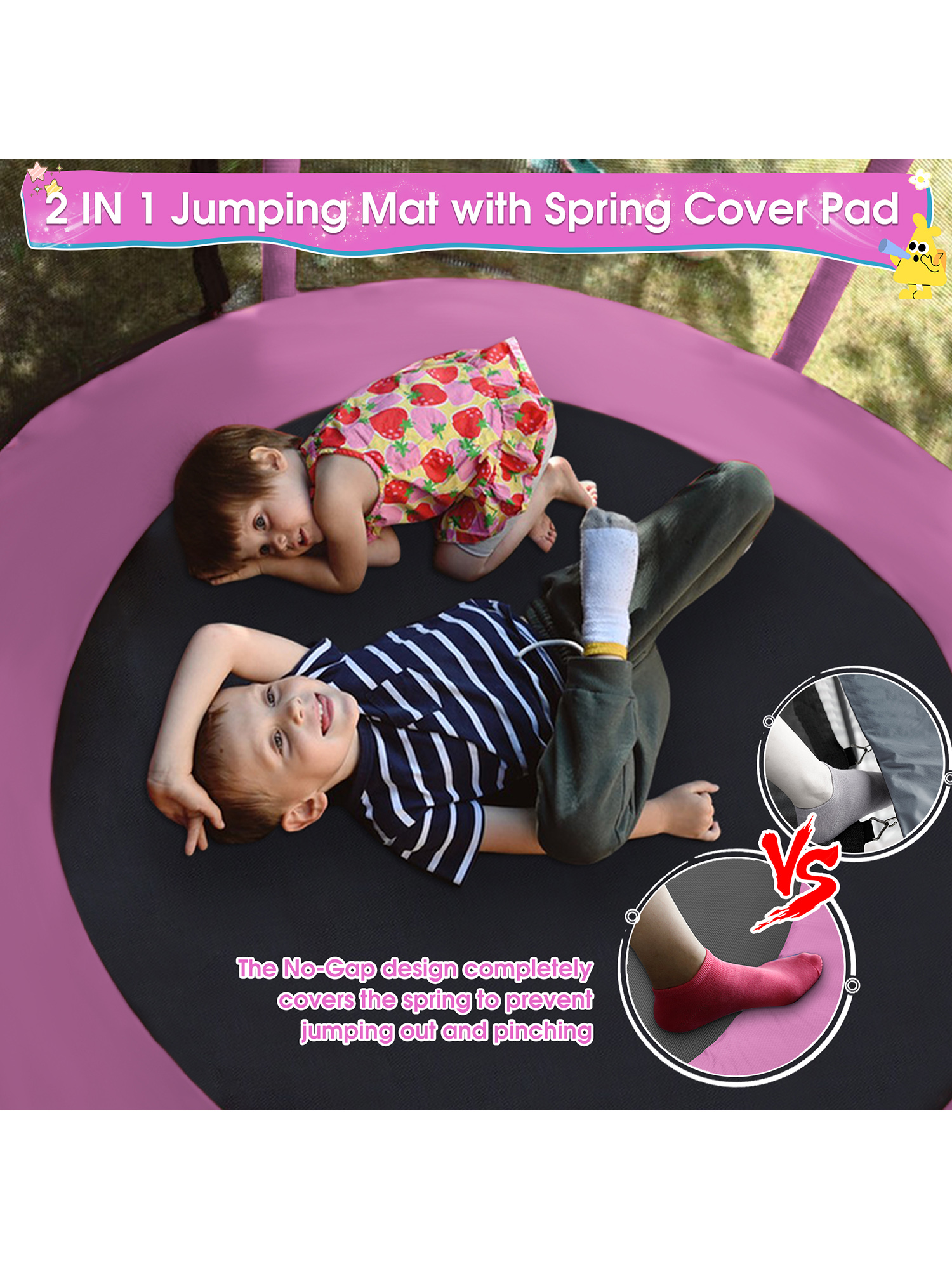 - Strong & Steady Structure: The 5.4ft high, 360-degree enclosure net, made of high-density, eco-friendly PE material, provides complete safety coverage during play. A double-lock zipper and safety buckle offer added childproof protection, keeping kids secure inside while jumping. The safety net poles are wrapped with 10mm thick foam padding, effectively preventing injuries caused by accidental collisions. Each leg features a full-area ground contact design, offering greater stability and balance compared to traditional two-point touchdown legs. This upgraded structure minimizes tipping risks and ensures a sturdier, safer jumping experience — even during energetic play.