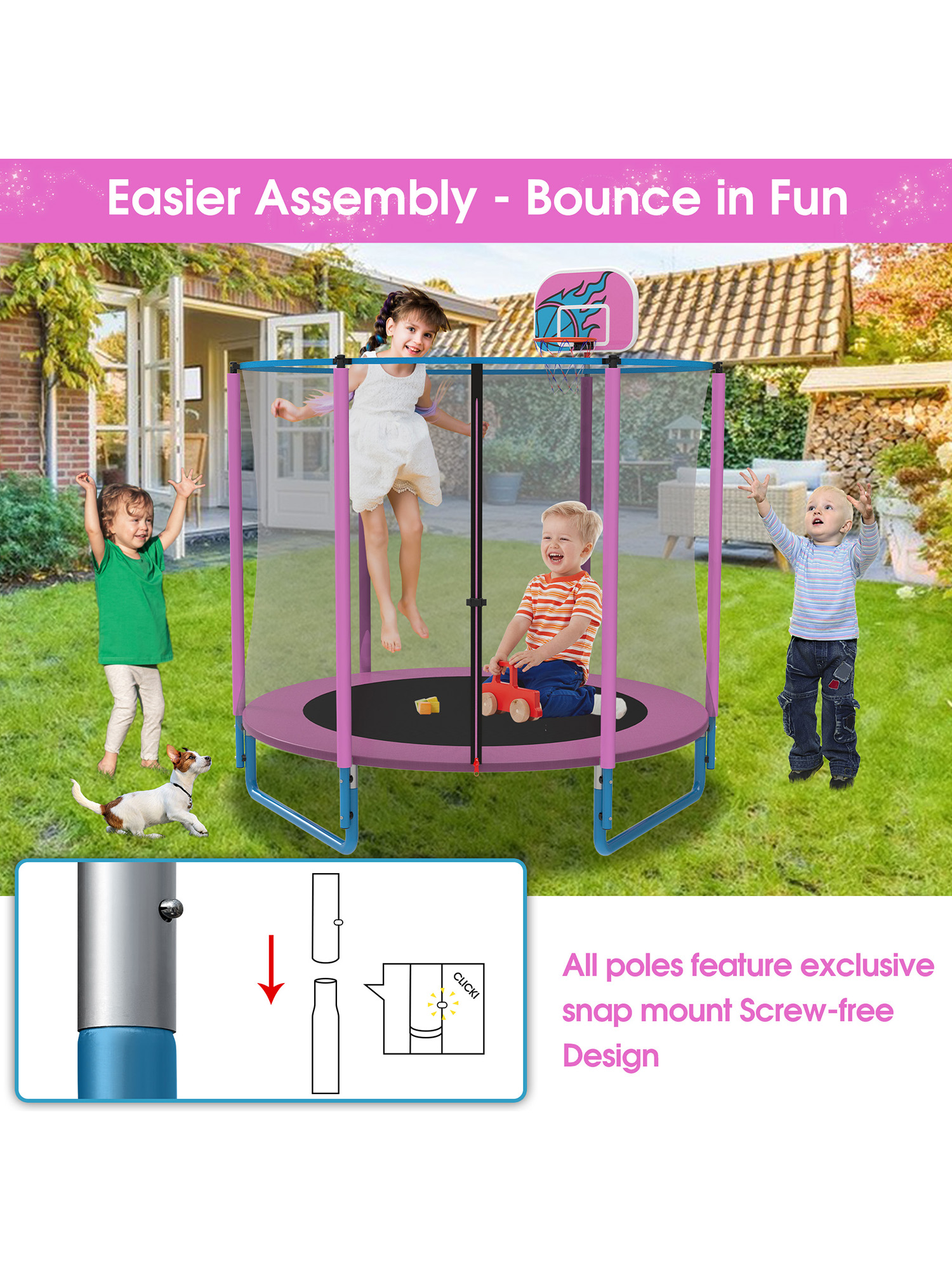 - Easy to Assemble & Professional Service Team: Assembling your trampoline is fast and straightforward, thanks to a clear, detailed instruction manual and two spring-loading tools for faster setup. With two adults, assembly can be completed in just about 1 hour. The trampoline features screw-fixed connections between the legs and poles for added frame stability, while all other parts use quick-release joints for effortless installation and takedown. This smart hybrid design combines strength with convenience. offers a 30-day money-back guarantee, an 24-month warranty, and attentive customer service, ensuring a worry-free experience from start to finish.