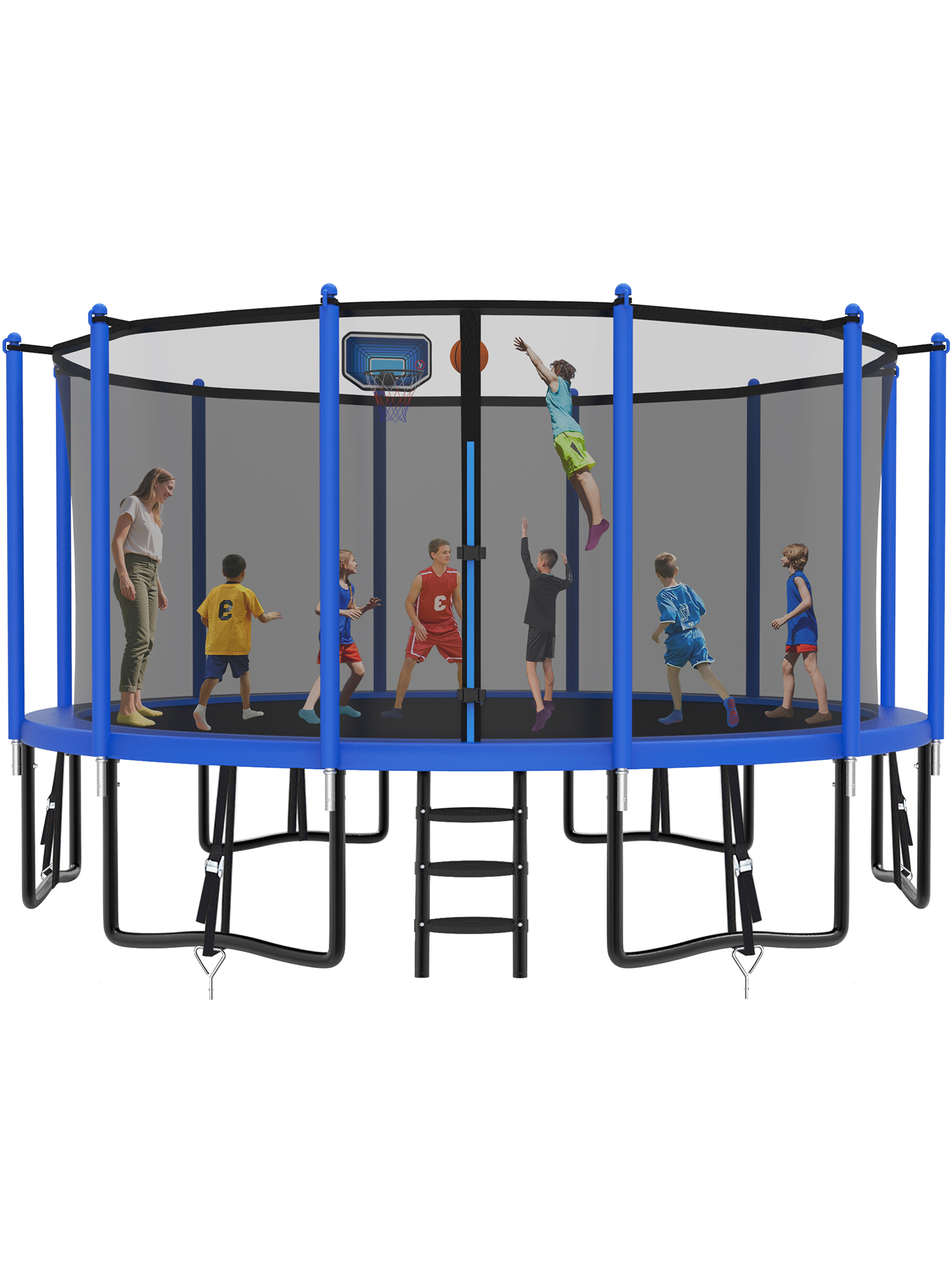 - Safety is Top Priority: The latest 14FT trampoline is thoughtfully engineered with curved safety poles, creating a generous 21.5-inch buffer between the enclosure net and poles. This innovative design helps prevent accidental collisions, offering safer, more enjoyable bouncing for kids and adults alike. Our no-gap design tightly connected the jumping mat to the spring cover, effectively eliminating dangerous gaps where hands or feet could get caught, while also maximizing the usable jumping space. All springs are fully covered features a 15mm thickened spring pad, which wraps around the springs and frame to prevent injury.