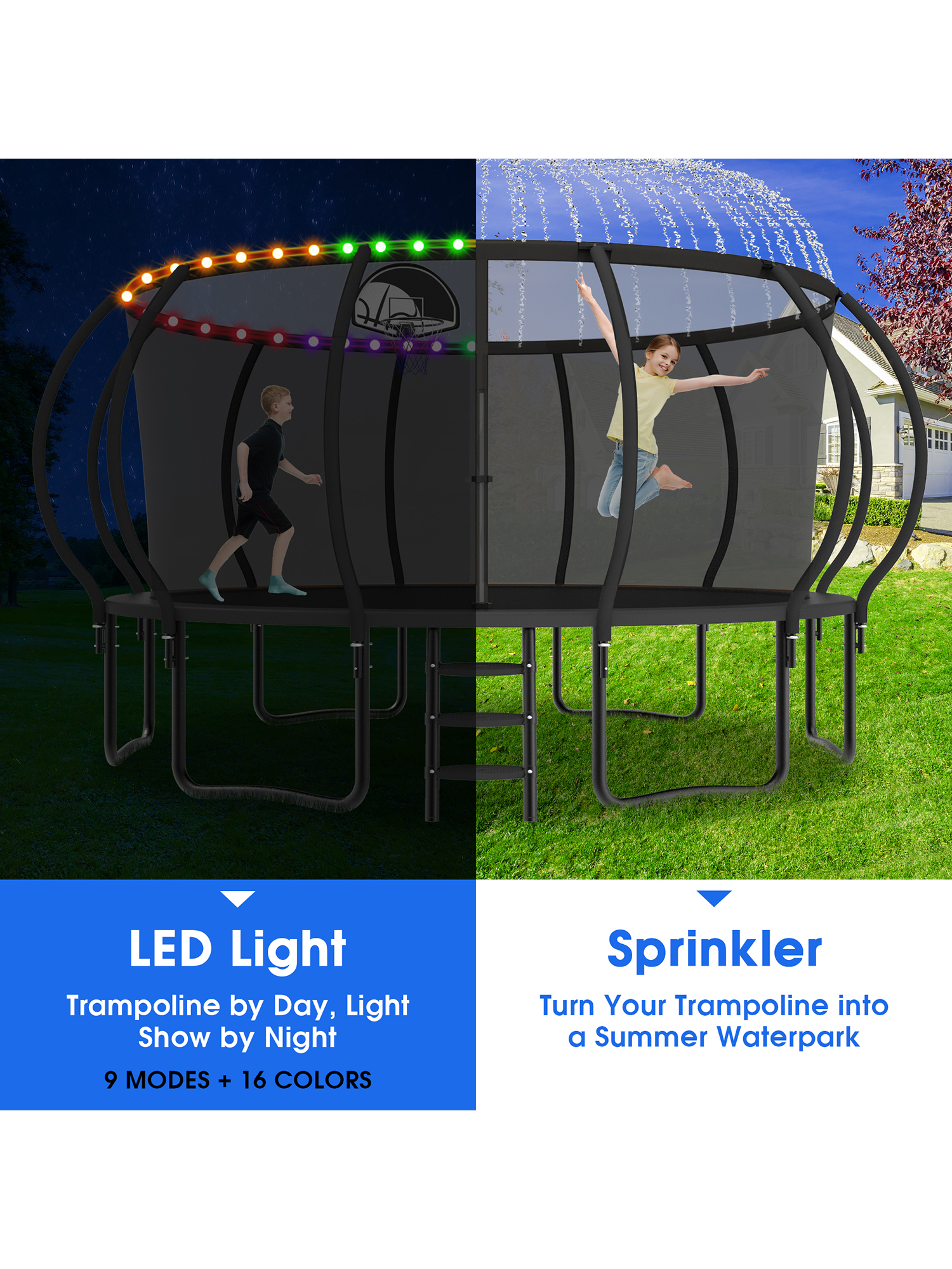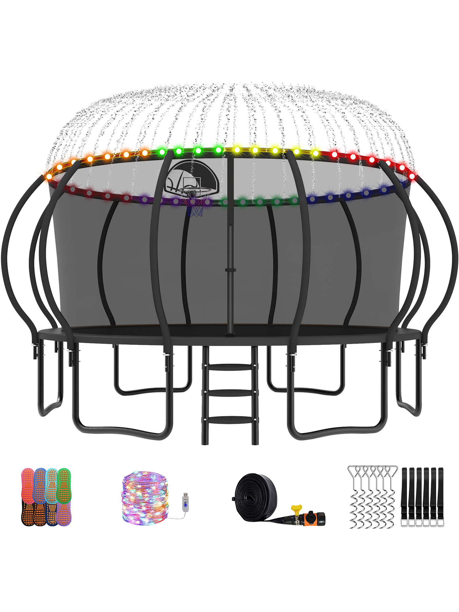 Beta Series Trampoline with Basketball Hoop and Light, Sprinkler & Sock Set Black