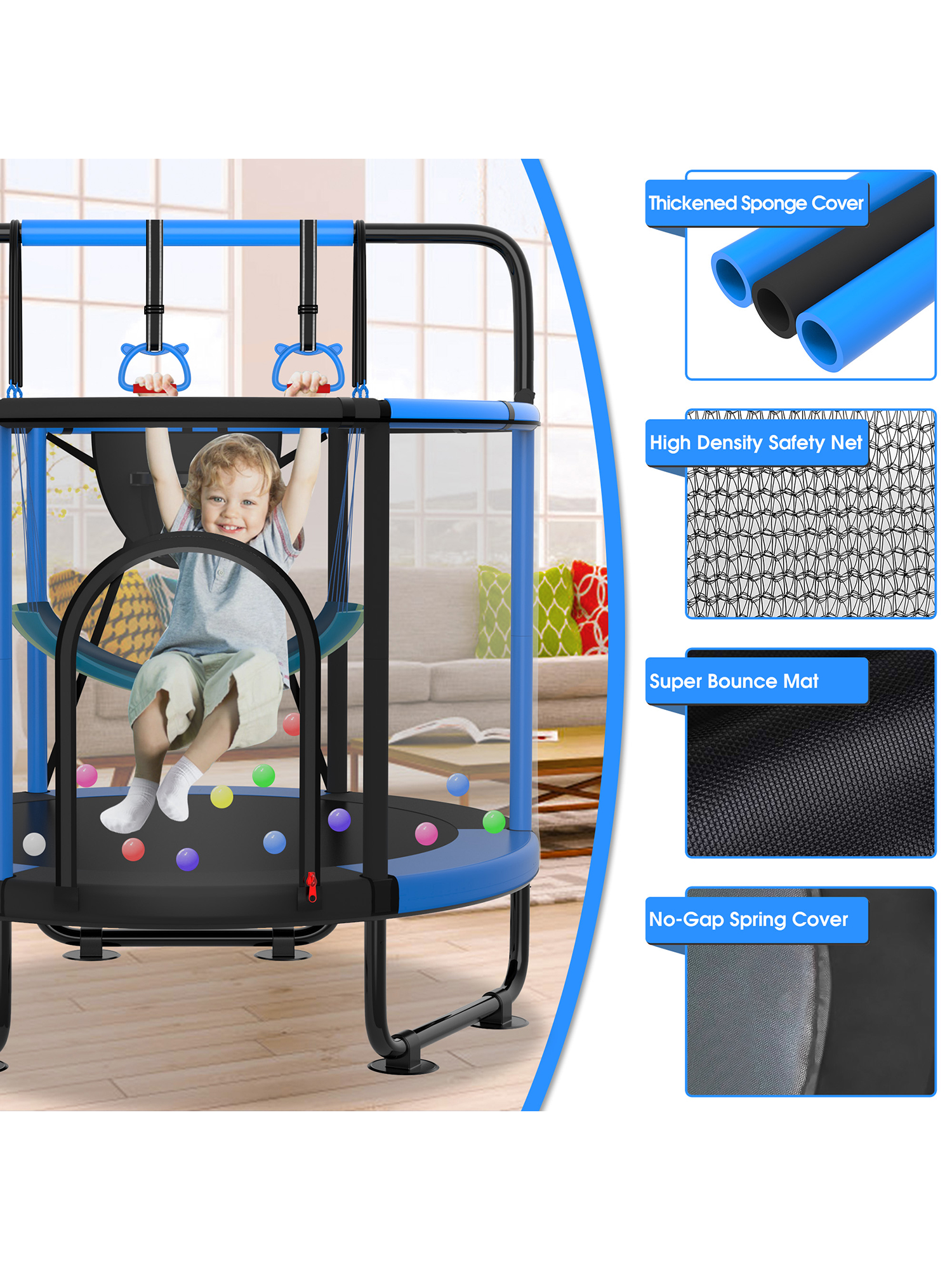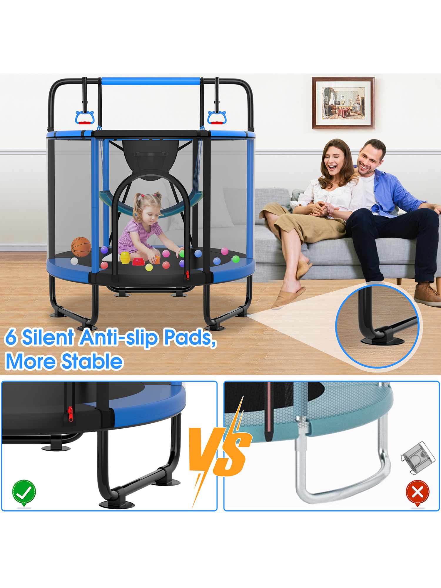 - Strong & Steady Structure: The 5.4ft high, 360-degree enclosure net, made of high-density, eco-friendly PE material, provides complete safety coverage during play. A double-lock zipper and safety buckle offer added childproof protection, keeping kids secure inside while jumping. The safety net poles are wrapped with 10mm thick foam padding, effectively preventing injuries caused by accidental collisions. Each leg features a full-area ground contact design, offering greater stability and balance compared to traditional two-point touchdown legs. This upgraded structure minimizes tipping risks and ensures a sturdier, safer jumping experience — even during energetic play.